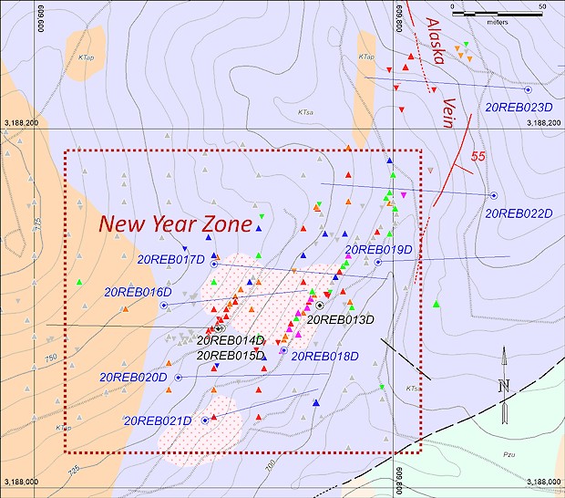 Figure 1: Plan View of the New Year Zone and Alaska Vein with Drill Traces