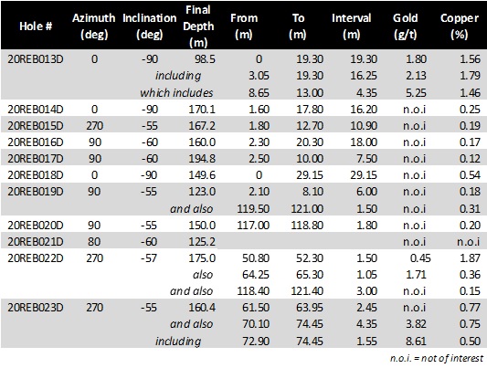 One of the most significant intervals was in vertical hole 20REB018D with 0.54% copper over an interval of 29.15m from surface (Table 1). Hole 20REB018D was collared approximately 50m South of hole 20REB013D which returned 2.13 g Au/tonne and 1.79% copper over an interval of 16.25m from 3.05m (News Release dated July 15, 2020).